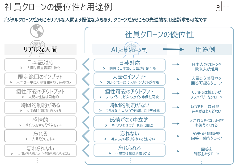 クローンは、時間や場所の制約を受けないため、社員本人が休暇を取得した場合でも、他の社員からの質問に受け答えをしたり、社員本人に代わって業務を行うことが可能です。そのため、業務の持続性や生産性が向上し、本人だけでなくチーム全体での柔軟な働き方が実現できます。また、クローンを活用することで、生身の人間だけでは生み出すことができない付加価値も生まれることが期待されます。