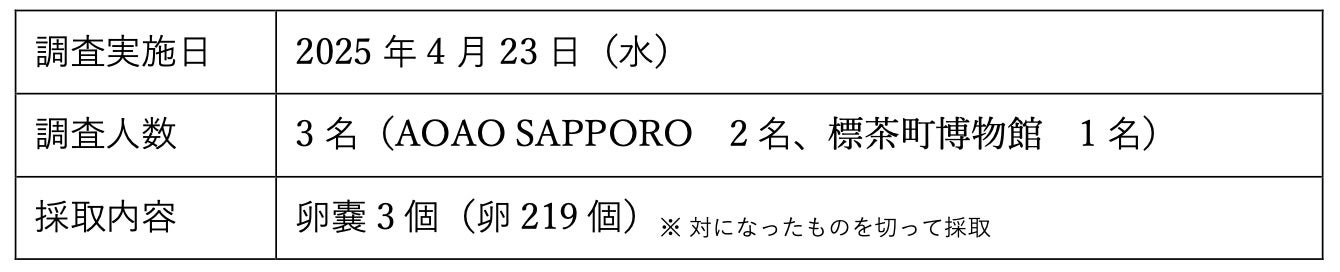 本取り組みでは、「キタサンショウウオ」の個体数の回復を目指し、AOAO SAPPOROの生物担当スタッフが現地・標茶町を訪問し、標茶町博物館とともに生息域の調査と卵嚢の採取を実施しました。