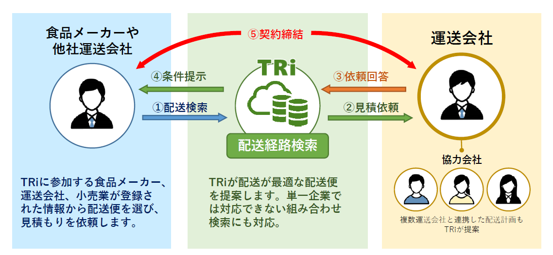 共同配送マッチングサービス「TRi」とは、トラックドライバー不足をはじめとする物流業界で懸念されている社会課題に貢献することをめざして共同開発したシステムです。メーカーなどの荷主が運送業者に配送を依頼したい場合だけでなく、共同運送を活用したい運送会社も利用でき、「TRi」で最適な配送便を選択すると該当の配送に関わる運送会社へ見積もり依頼を行うことができます。メーカーが新規の商流網を簡単に構築できるだけでなく、運送会社が自社で対応できないエリアの配送を企業の垣根を越えて委託できることで、共同配送を促進し効率の良い配送が可能です。