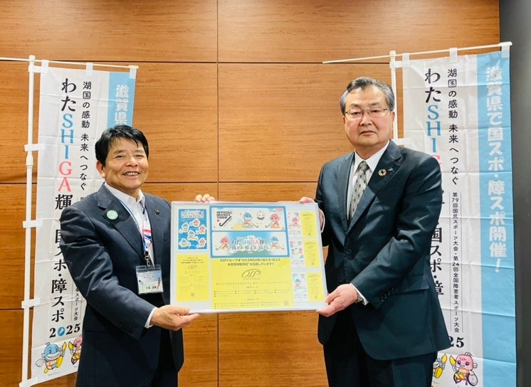 「わたSHIGA輝く国スポ・障スポ2025 」の啓発活動や推進に活用いただけるよう、車両用(180㎜×270㎜)400枚、配布用(148㎜×105㎜)20,000枚、スマートフォン用(94㎜×51㎜)3種類のデザイン各1,000枚、合計23,400枚を寄贈しました。