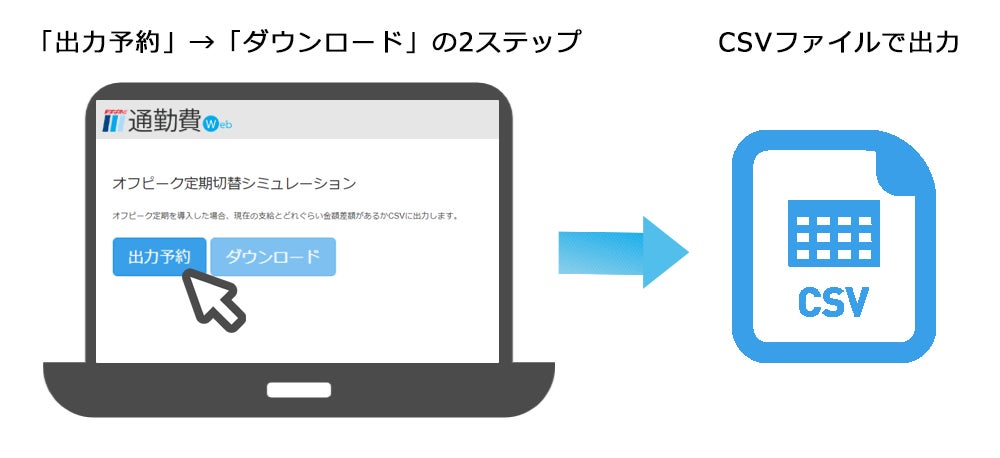 「オフピーク定期切替シミュレーション」機能は、企業がオフピーク定期券を導入した場合、通勤手当の支給金額がいくらになるかをシミュレーションできる機能です。「駅すぱあと 通勤費Web」に登録されている従業員ごとにオフピーク定期券が利用可能な通勤経路かを自動で判断し、“現在の支給額・オフピーク定期券を利用した場合の支給額・それらの差額”をCSVファイルで出力します。これまでは支給額の差額を算出する場合、従業員ごとにオフピーク定期券の適用可否を確認し、適用可能な場合はオフピーク定期運賃を調べ、通常の通勤定期運賃との差額を計算するという、膨大な労力と時間が必要でした。しかし、本機能では事前の作業等は必要なく、システムメニューで簡単なボタン操作のみでシミュレーションをしていただけます。