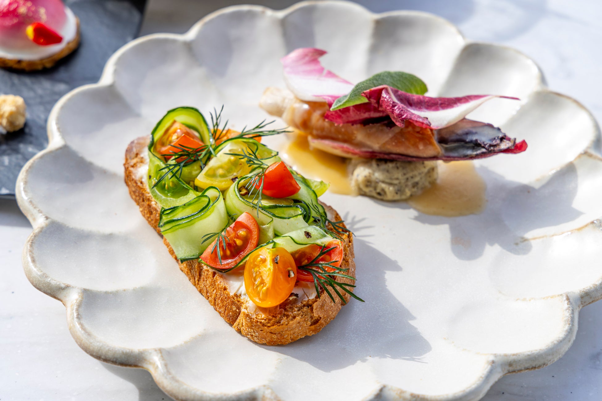 (写真左より)胡瓜とカラフルトマトのオープンサンド、レッドアンディーヴのサルティンボッカ