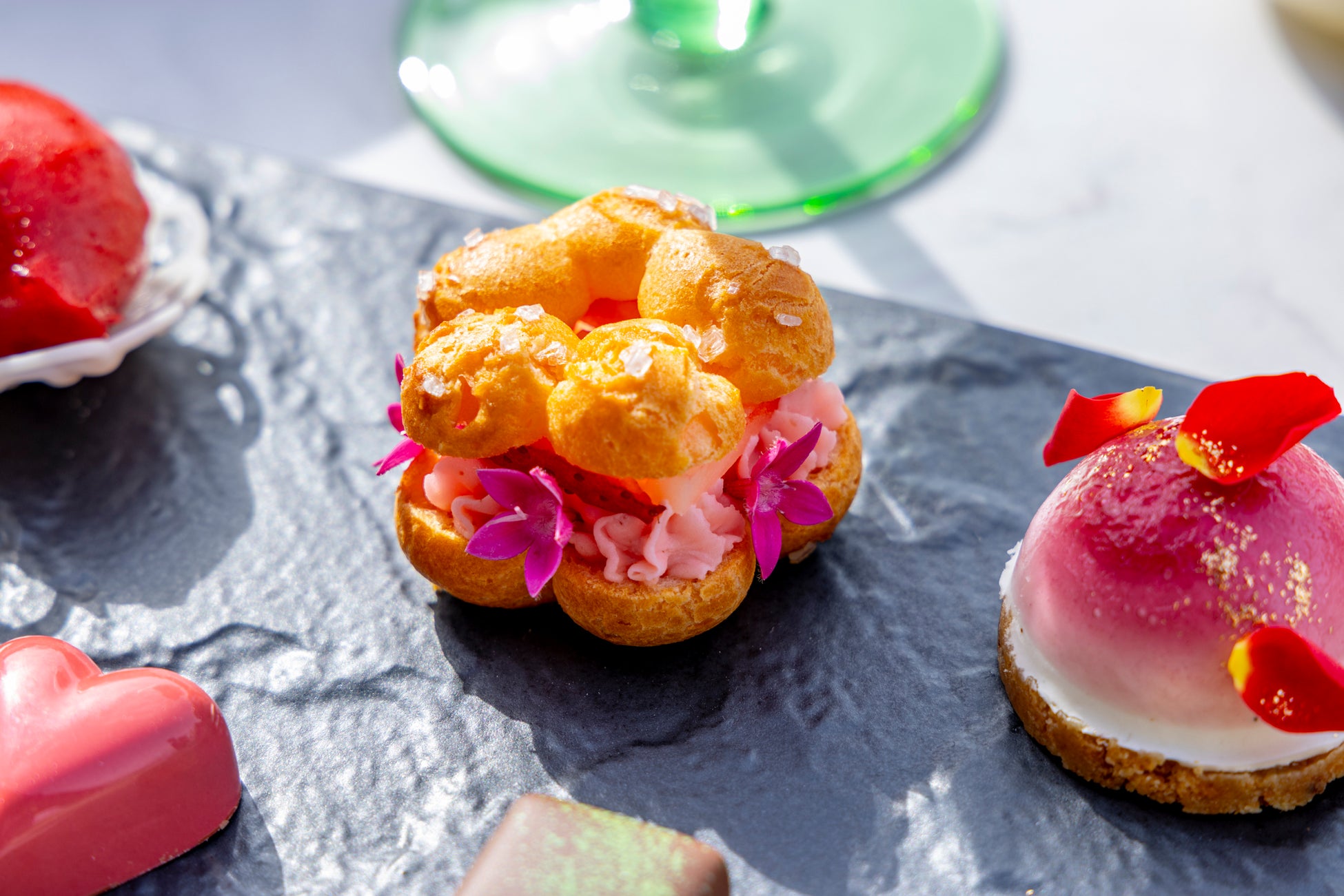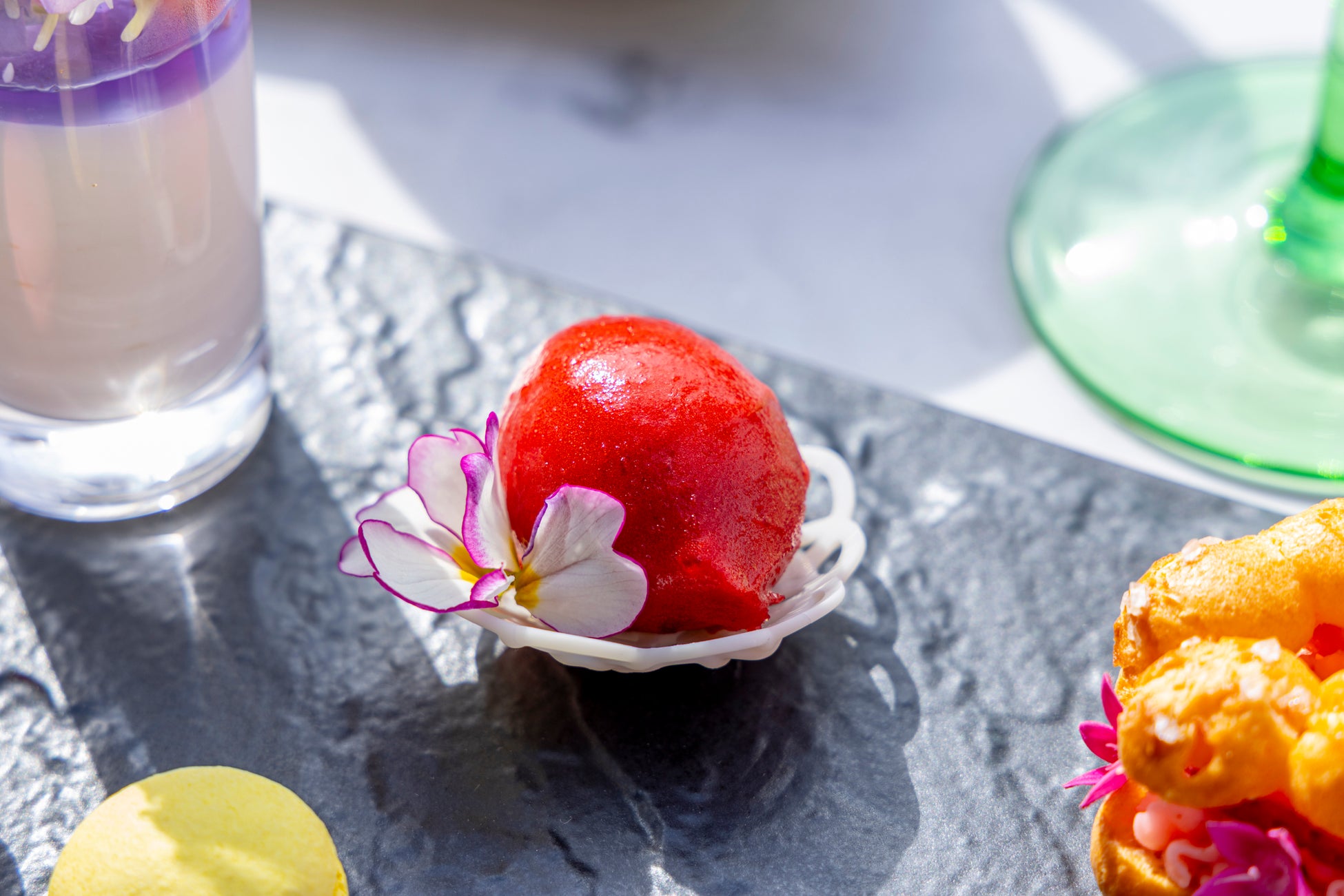いちごピューレとハイビスカスペーストを合わせた、溶けにくいシャーベット。ひんやりとした食感と爽やかな酸味が、アフタヌーンティーに華やかなアクセントを添えます。