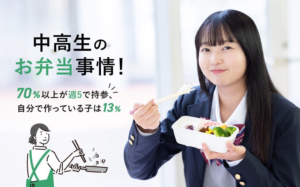 子どもが中高生になると、気になるのがお昼ご飯事情。給食がなくなり、学校にお弁当を持参する必要が出てくる方も多いのではないでしょうか。今回は中高生の保護者100名に、子どものお弁当づくりについてアンケートを行いました。お弁当作りが始まる前に知っておくとよいことや、実際の調査結果をもとにしたお役立ち情報をお届けします。