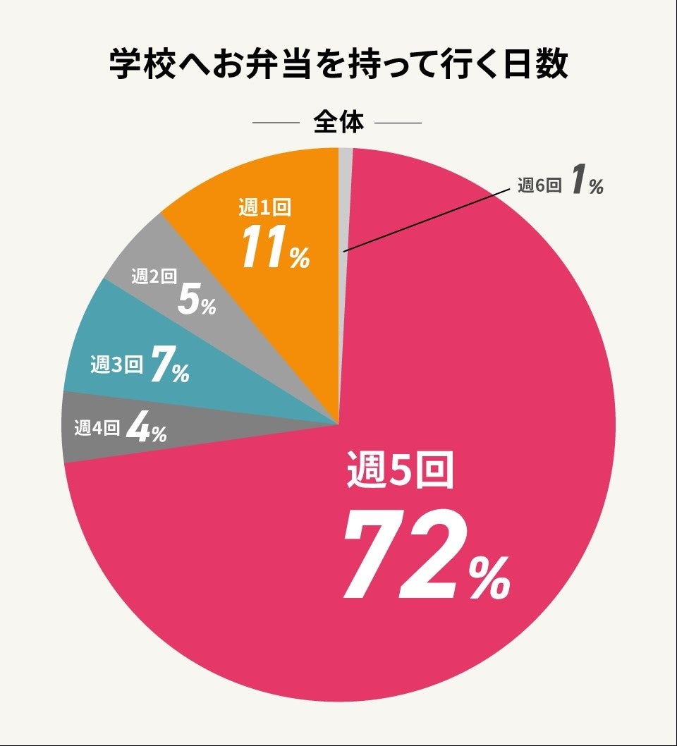 子どもが学校にお弁当を持参していると答えた人に、週に何日持って行っているかを尋ねました。その結果、週5日と答えた方が全体の70%を超えることが分かりました。