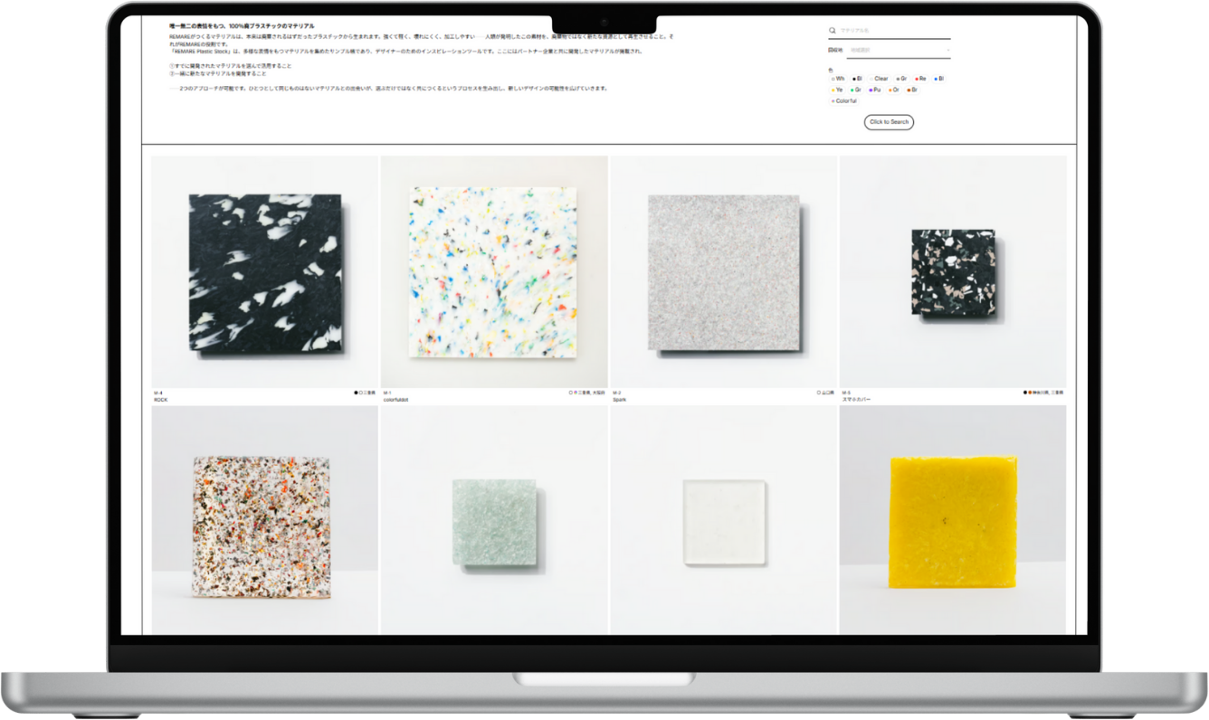 REMAREは、企業が抱える廃棄プラスチックから意匠性のある内装建材の開発を行い、社内活用や社外への販売支援 を行ってきました。今回リリースする「REMARE PLASTIC STOCK」は、開発された内装建材をオンライン上で公開し、建築士や空間デザイナーへ内装建材の見た目だけでなく、廃棄プラスチックの由来の魅力を直接伝えることで、内装材への採用機会を広げる ためのツールです。