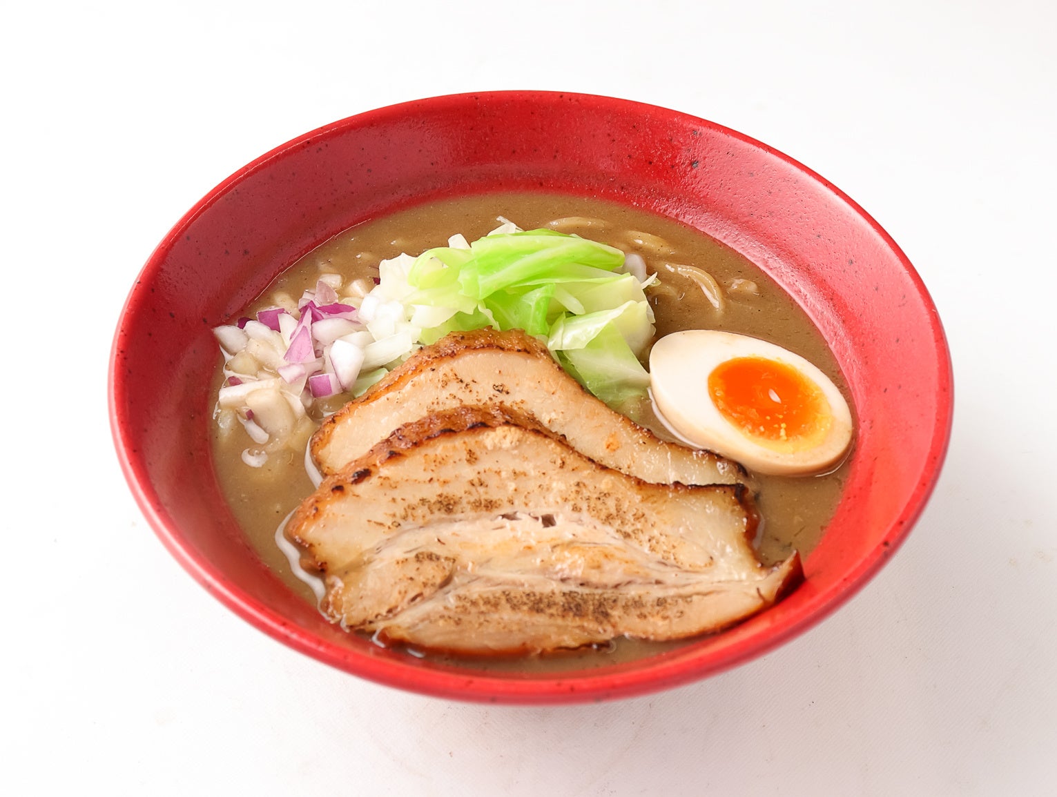 特製炙りチャーシューや味玉、ボイルキャベツ、玉ねぎ(アーリーレッド)をトッピング。