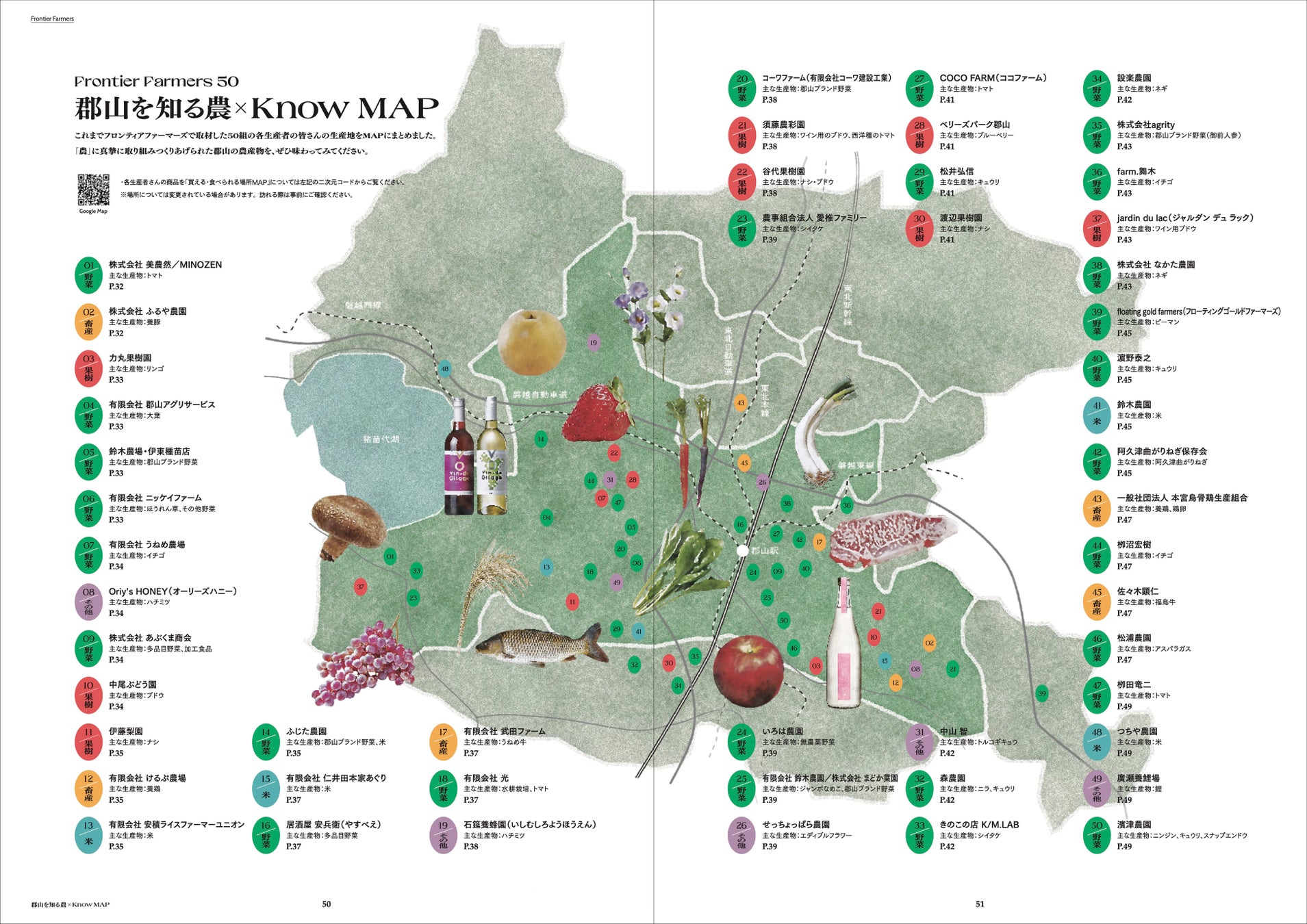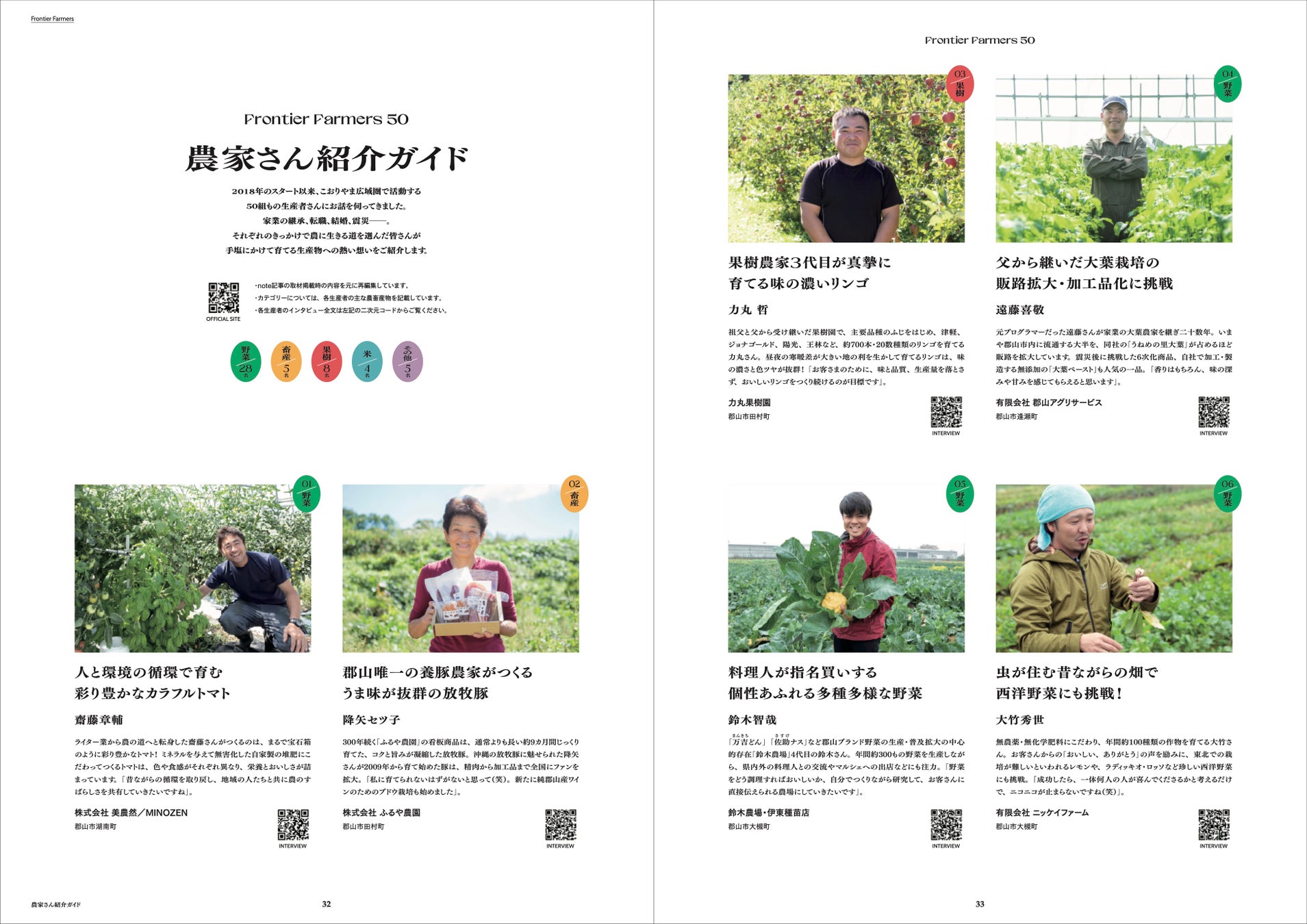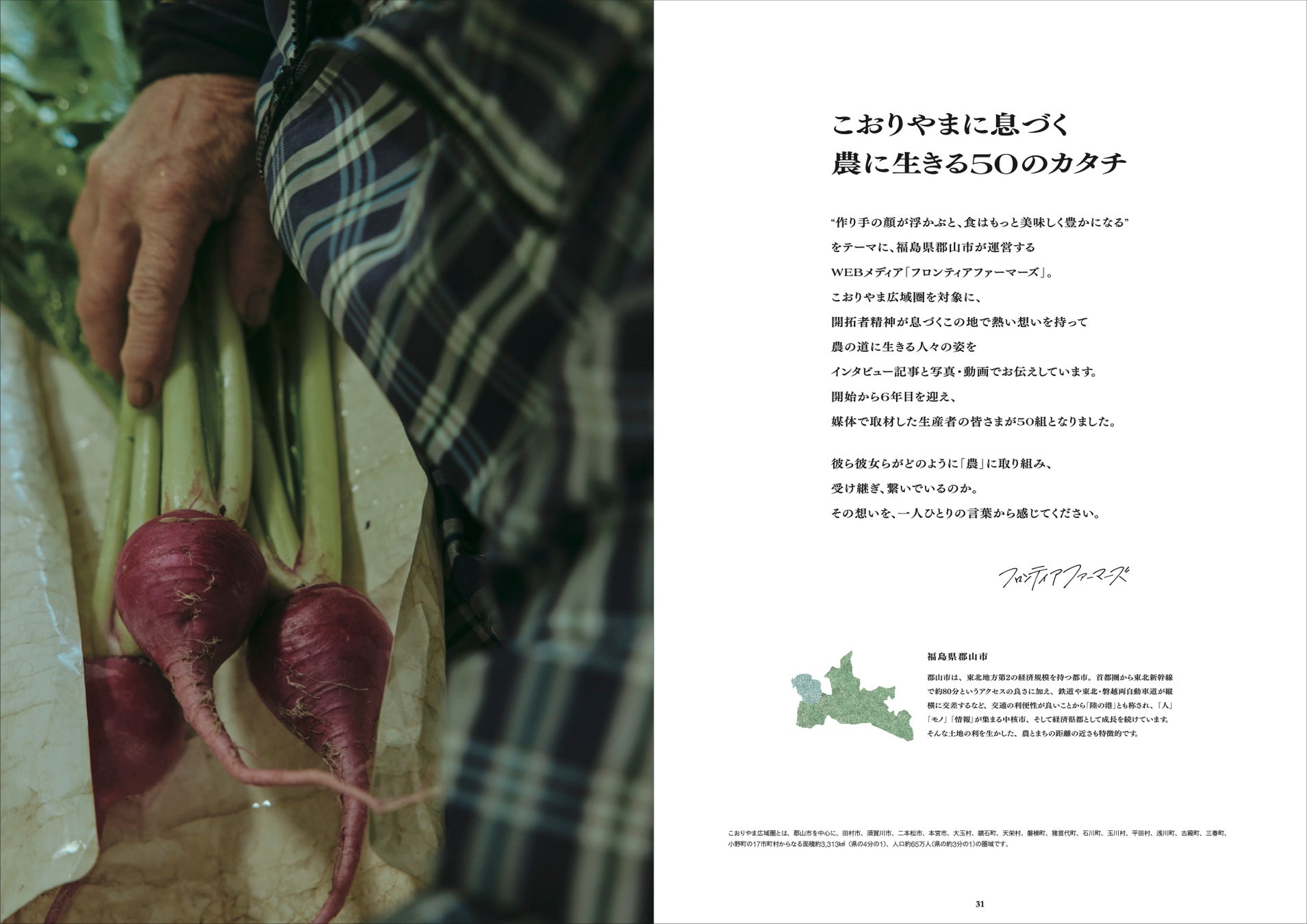 WEBメディア「フロンティアファーマーズ」は、開始から6年目を迎え、取材した生産者が50組となりました。これを記念して制作した本書では「コミュニケーションする農」をテーマに、農の担い手と料理する人・食べる人が相互に繋がり、豊かな食の輪を広げる姿を通じて、こおりやまの農とは何かを丁寧に紐解いています。