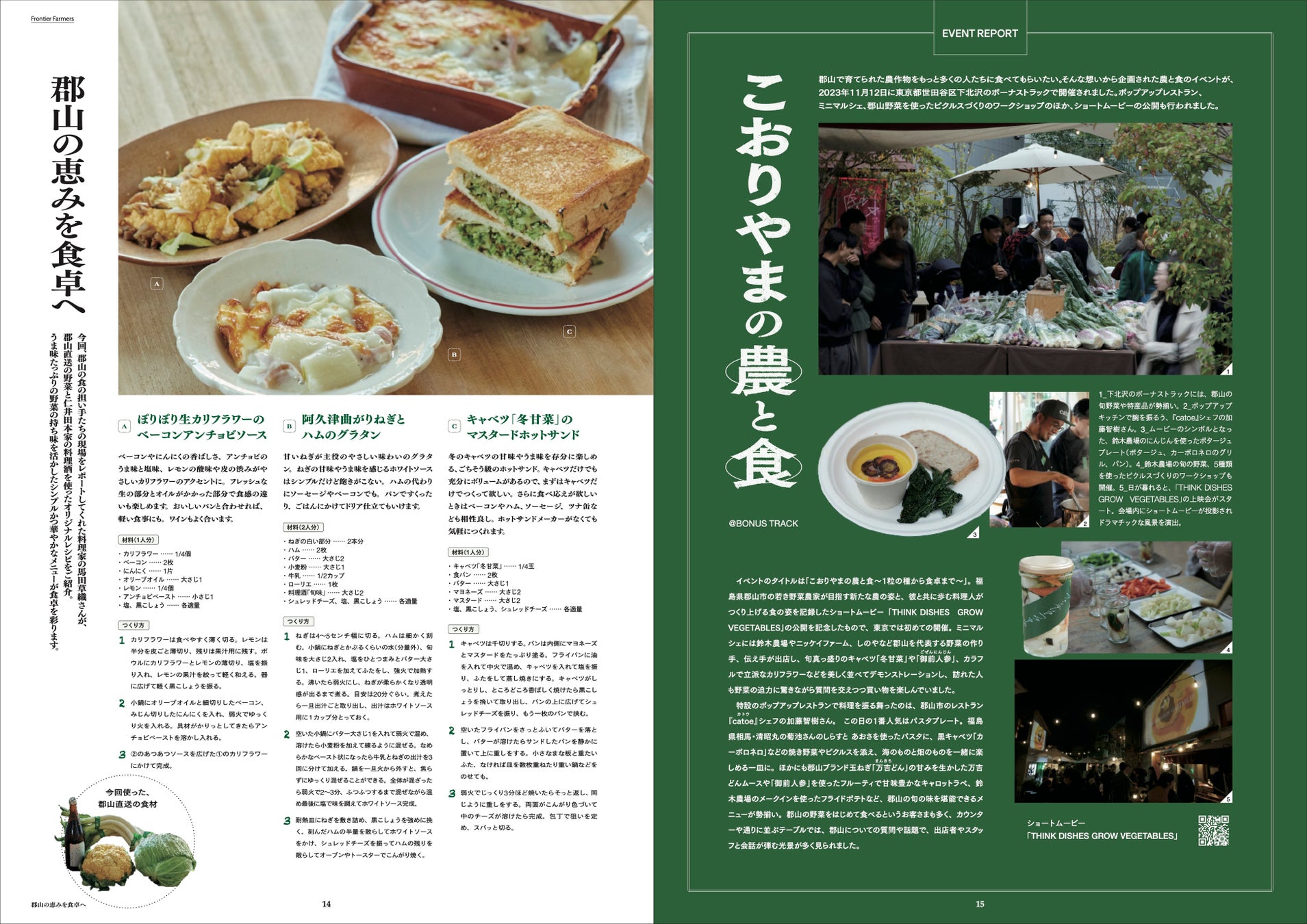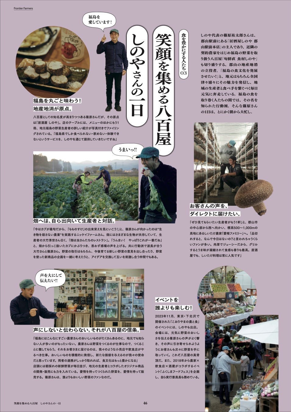 地元での収穫・発送から都市の料理人の手元に届き、調理して食卓に並べる様子までを追う実例企画や、こおりやまで活躍する農と食のキーパーソンを紹介するコラムも収録。熱い想いを持って真摯に農と食の道に生きる人々の関係性を通じて、こおりやまの農らしさを伝えています。