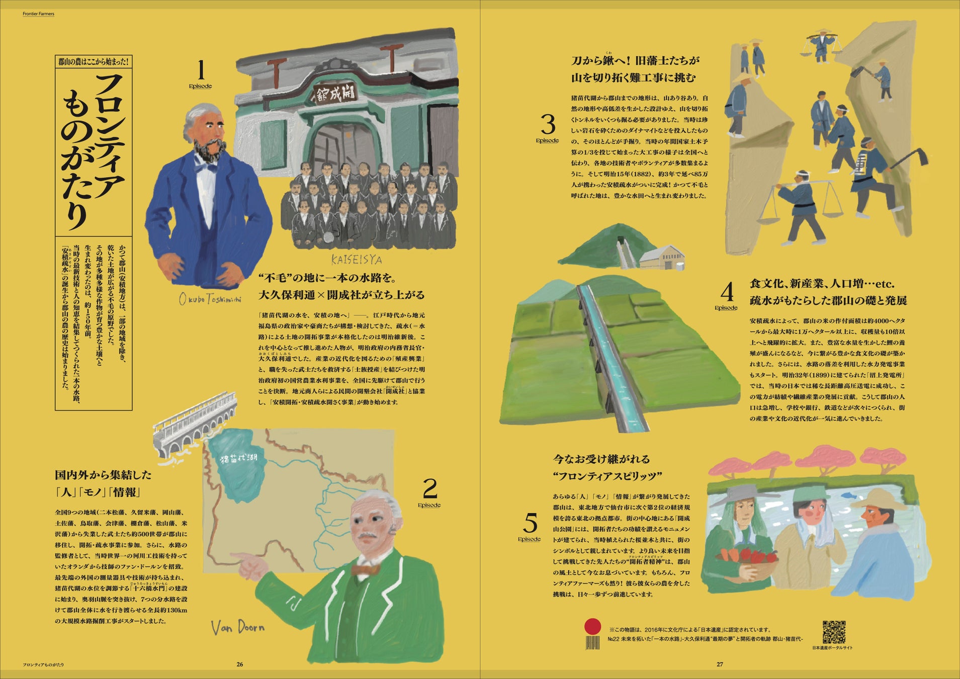 これまで取材した生産者のガイドのほか、生産地や買える・食べられる場所を網羅したMAPも掲載。また、こおりやま発展の礎となった安積開拓の歴史をイラストで分かりやすく伝えるコラムや、農産物や人・土地の姿を美しく情緒的に捉えたビジュアル写真なども掲載しています。