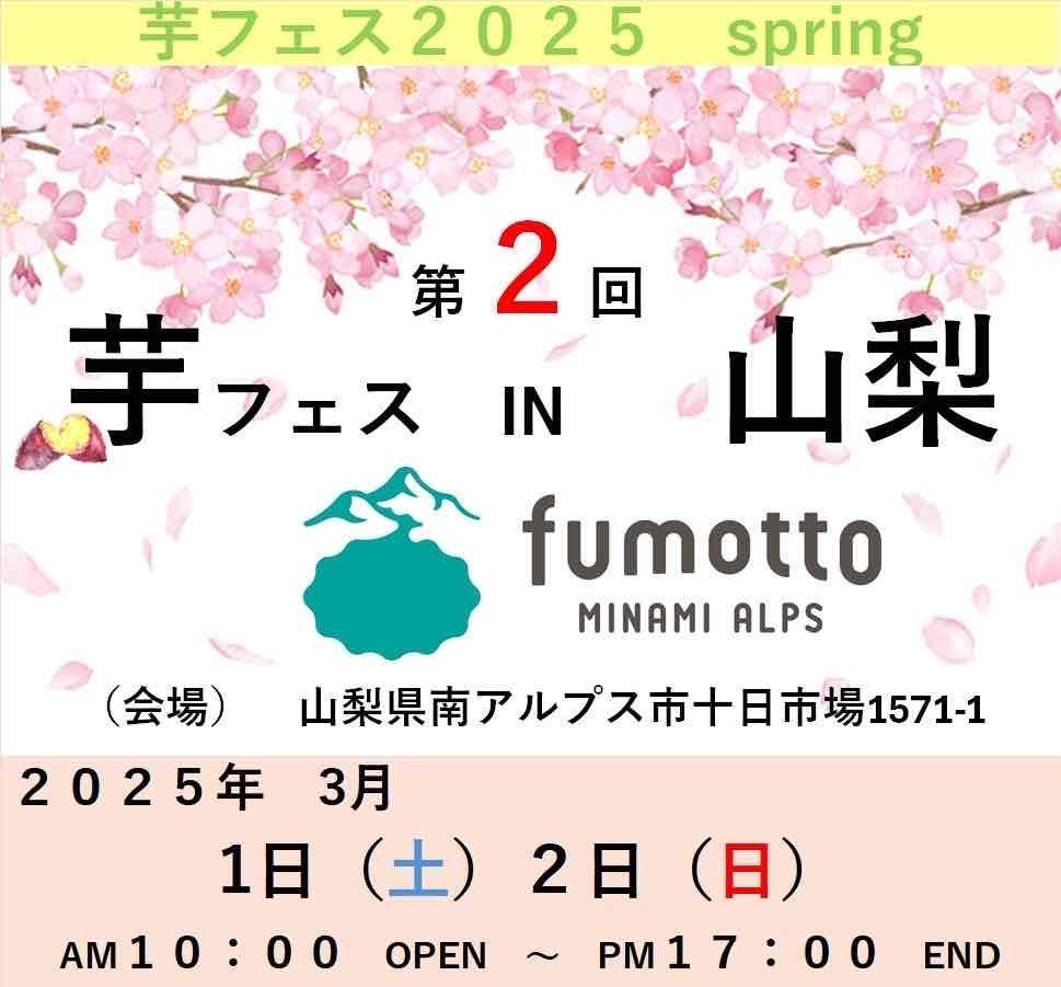 株式会社ロトが主催する「第2回芋フェス!IN fumotto 山梨」が、2025年3月1日2日、山梨県南アルプス市 fumotto南アルプスでの開催が決定しました。