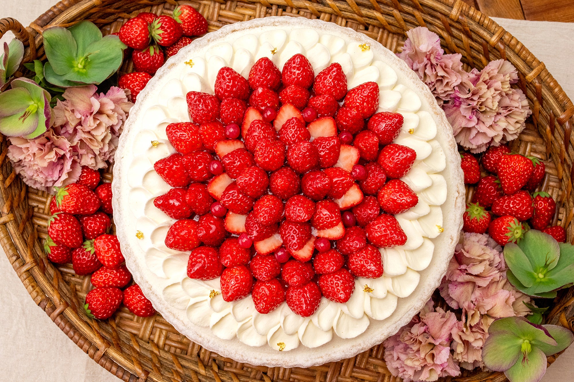 なめらかなマスカルポーネクリームとベリージャムを重ね、イチゴとともに、花びらのようなクリームをあしらいました。赤いカーネーションの花言葉は「母への愛」。真っ赤に咲くその姿をイメージした、華やかなタルトです。大切なお母さんへ、感謝の想いをやさしく届けます。