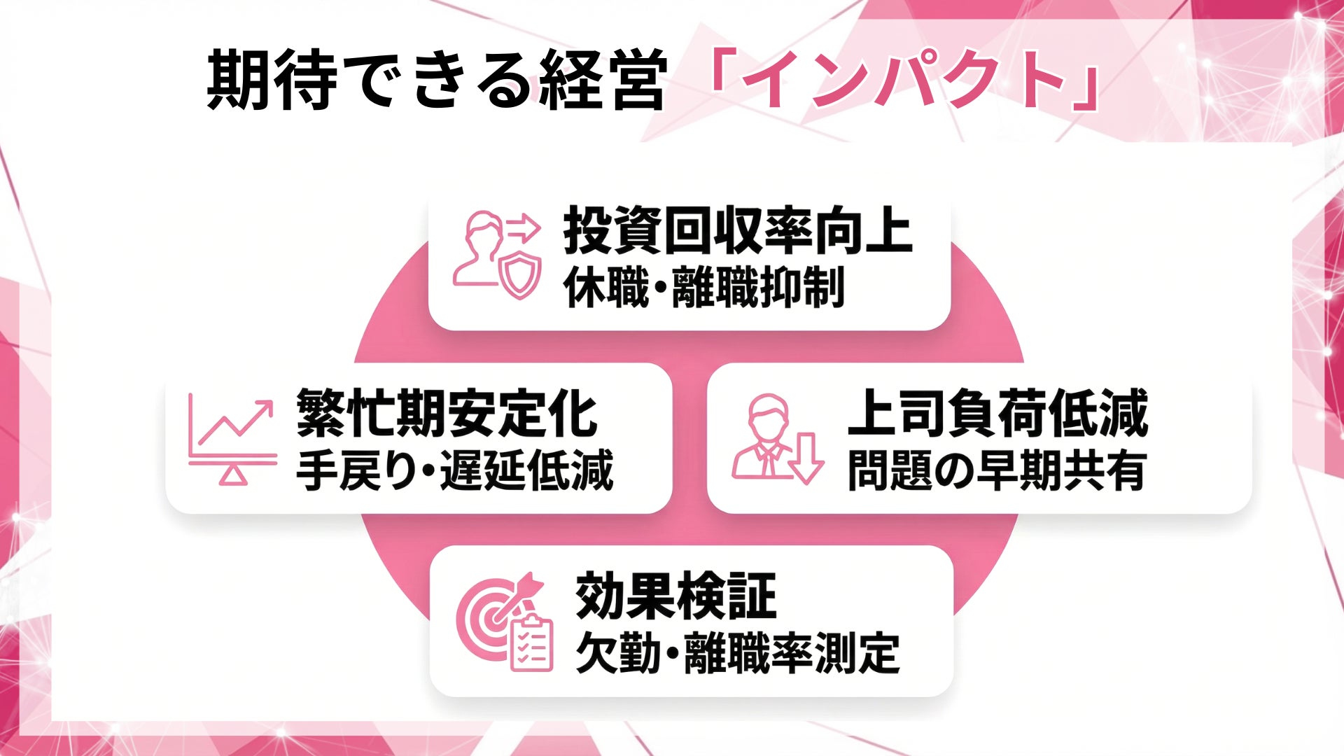 3カ月後に欠勤・離職率・プレゼンティーズム等で効果検証し、次年度へ反映