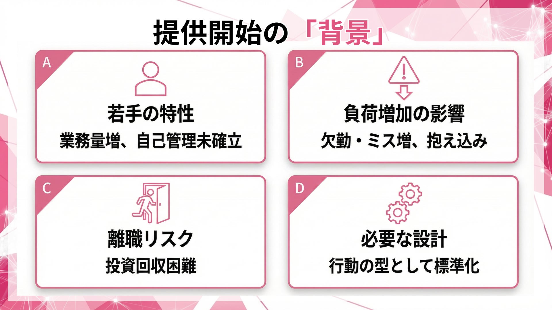 若手の早期離職、繁忙期の崩れ、異動後の不調、プロジェクトの手戻り・遅延が課題の企業様には、現状整理から研修設計、上司巻き込み、1〜3カ月フォロー、KPI設計まで一体でご提案します。