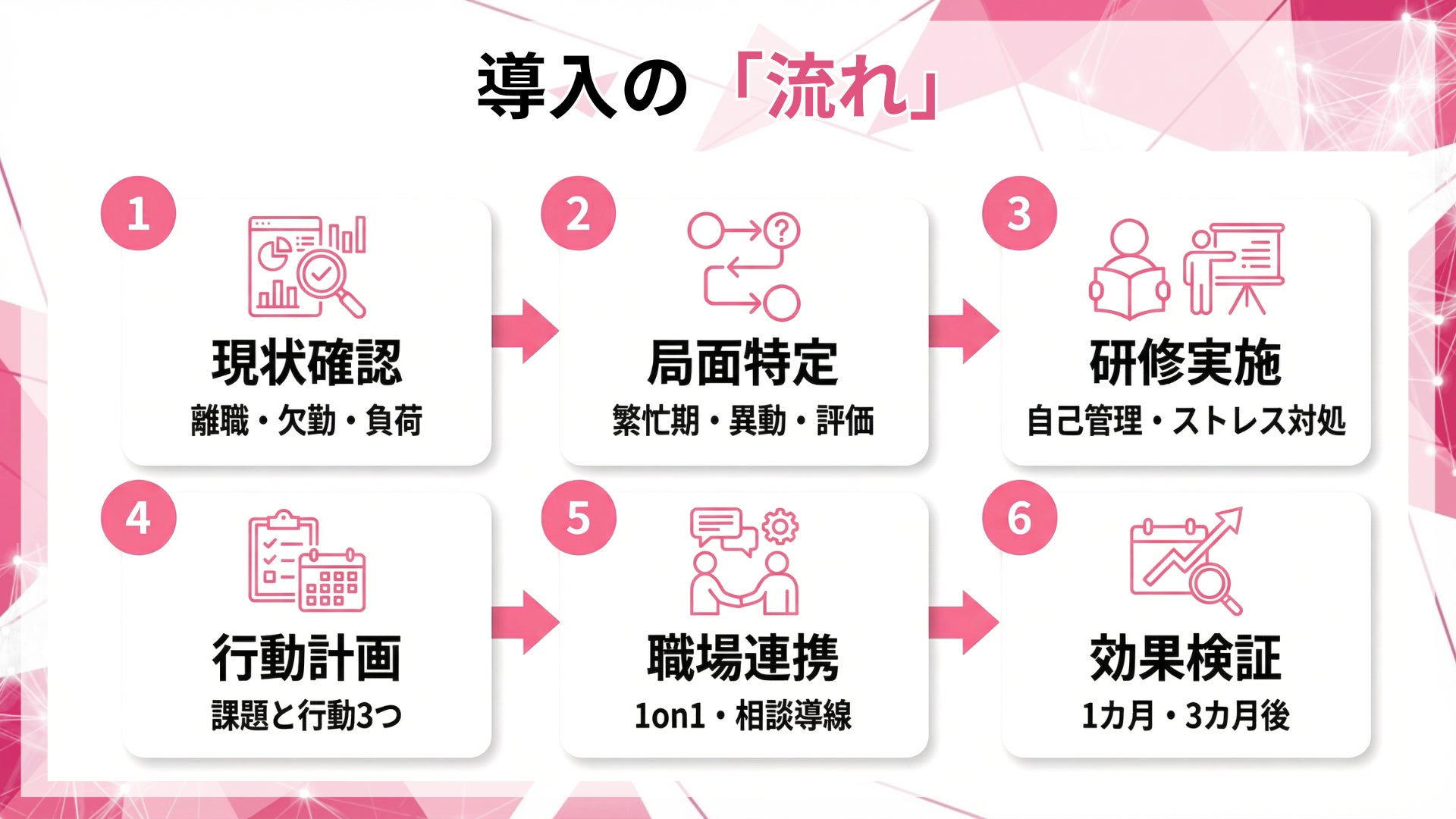 研修で終わらせず、上司の1on1、相談導線、チームの働き方ルールと連動させ、KPIで効果検証できる運用として実装します。