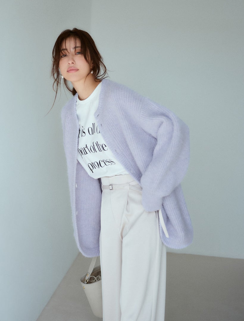 春を先取って、ラベンダー色のニットカーディガンを。比翼仕立てや丸みを帯びた裾など、気の利いたポイントが随所に。ロゴTシャツに羽織れば肩ひじ張らないコーディネートが完成。