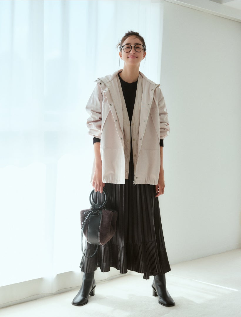 微光沢のマウンテンパーカーはこなれたムードで、友人との再会にぴったり。キルティングのライナー付きで防寒対策も。裾を少し絞って、アコーディオンプリーツスカートとのバランスを調整。