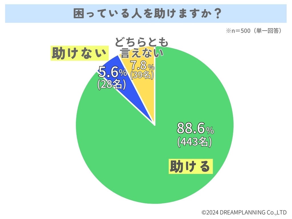 まず最初に、困っている人を助けるかという質問に対し、9割近くの方が助けると答えました。助け合いは日本人にとって美徳と言える結果となりました。