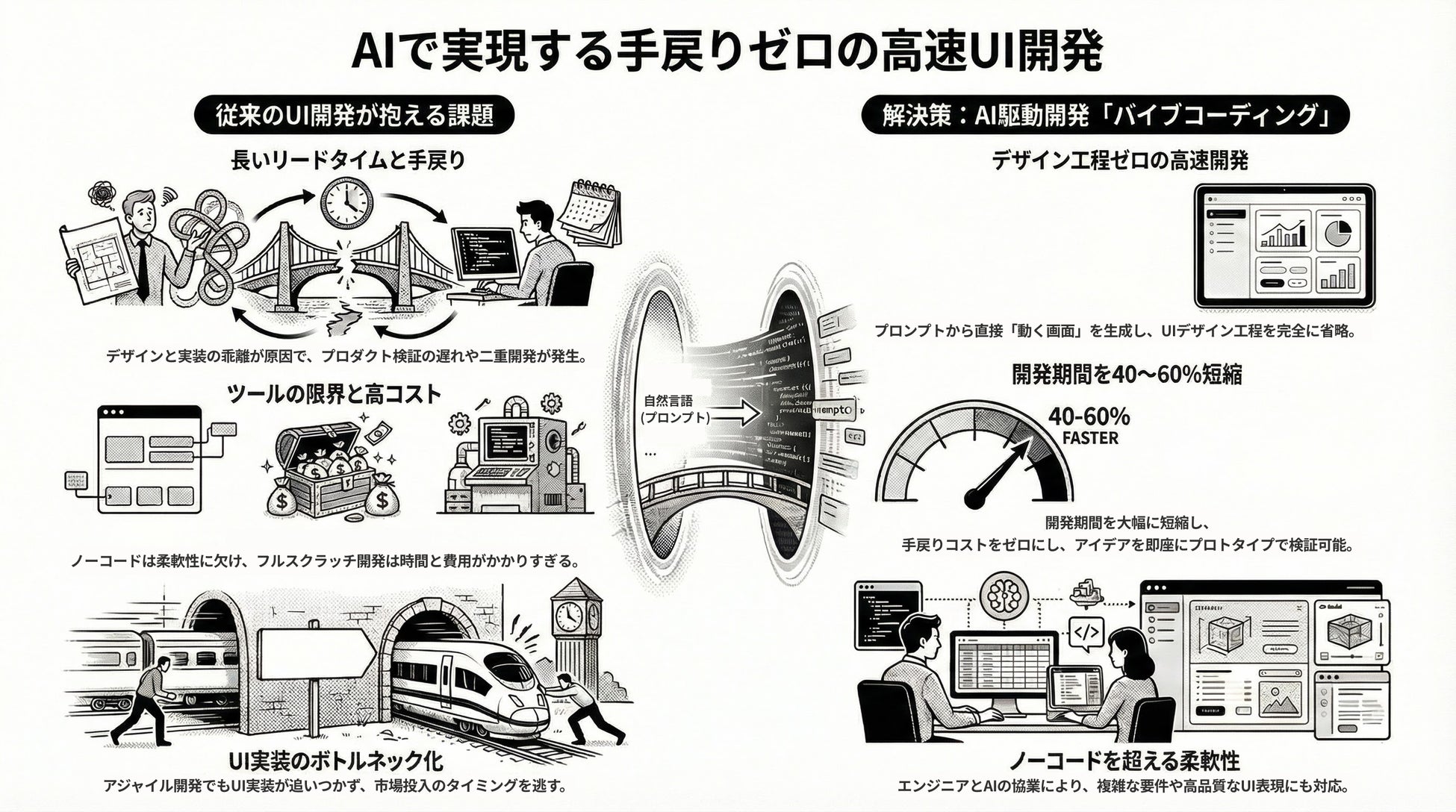 プロンプトから本番コードを直接生成。デザイン工程ゼロで開発期間最大60%短縮、手戻りゼロのUI/UX開発を実現