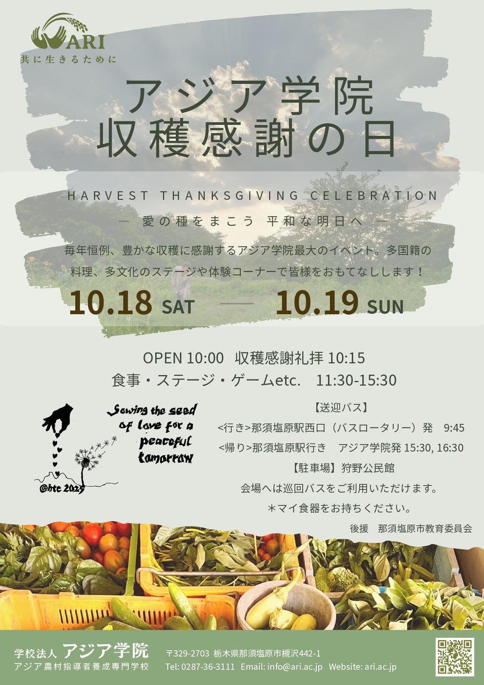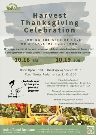 毎年恒例、豊かな収穫に感謝するアジア学院最大のイベント。多国籍の料理、多文化のステージパフォーマンスや体験コーナーで皆様をおもてなしします♪