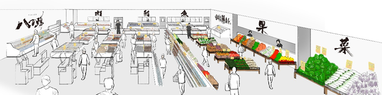 八百鮮 魚崎南店は、約160坪の売場で生鮮食材を中心に販売してまいります。生鮮三品(畜産、青果、鮮魚)の売上構成は85%を想定しており、生鮮市場というコンセプトを掲げ店内を活気のある市場として演出していきます。これまで大阪府を中心に展開してきた八百鮮店舗は、商店街での出店を続けてまいりましたが、この度は、関西圏初のロードサイド型の出店となります。約160坪の小さな売場面積ではありますので、その分在庫を持たず、日々の売り尽しを行い、在庫回転数を上げることで鮮度・品質を高めるという、創業以来大切にしてきたモットーは、これまでと変わりなく、引き続き八百鮮独自の販売スタイルを構築していきたいと思います。販売促進策としましては、原則として折込チラシを出さず、商品をお求めやすい価格でご提供させていただくEDLP(エブリデー・ロー・プライス)を採用いたします。