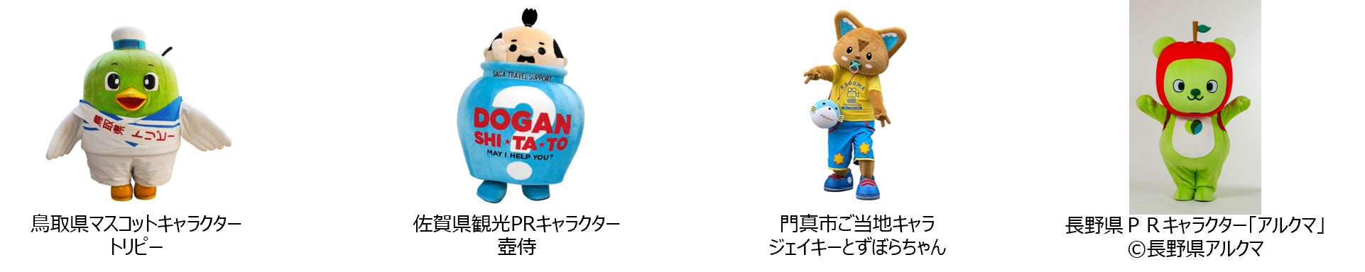 各地の大人気マスコットキャラクターたちが集結します!「鳥取県マスコットキャラクター トリピー」・「佐賀県観光PRキャラクター 壺侍(つぼざむらい)」・「門真市ご当地キャラ ジェイキーとずぼらちゃん」・「長野県PRキャラクター『アルクマ』」たちとふれあい、一緒に楽しいひとときを過ごすことができます!