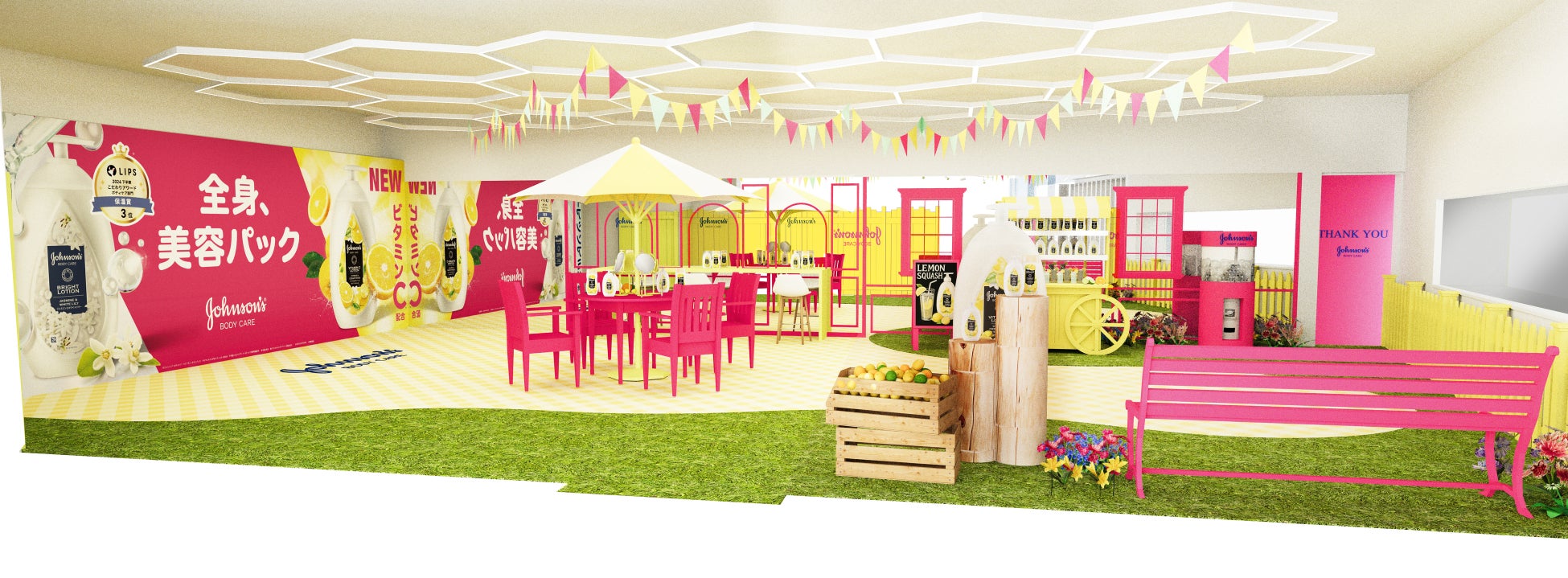 本イベントは、10 月 1 日から展開しているデジタルキャンペーン「超ときめき♡宣伝部 × ジョンソンⓇボディケア コラボレーションキャンペーン ~『全身美容パック』で、ときめく私に~」 と連動したブランド初の POPUP イベントです。会場には、Web CM の中でメンバーが住んでいる、架空のシェアハウス「とき宣ハウス」にある庭を表現。ジョンソンⓇボディケアの配合成分でもあるビタミン C をイメージした、柑橘カラーの爽やかで、気持ちも上がる空間が広がります。