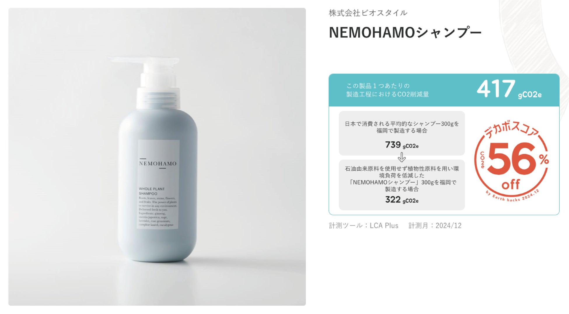 Earth hacks が提供する、製品やサービスにおけるCO2排出量*の削減率をスコア化した指標です。従来の素材や手法を用いた商品等と比較し、環境に配慮した工夫によって変化するCO2排出量の削減率を表示し、製品やサービスの環境貢献度をひとめで、わかりやすく伝えます。2022年7月に提供を開始し、2024年10月時点で350以上の製品・サービスへ導入されています。