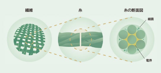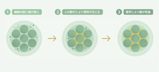 「電気の繊維」ピエクレックスは、村田製作所の圧電技術「でんき」と帝人フロンティアの合成繊維技術「せんい」の融合によって誕生した新素材です。人の動きにより繊維が動くと微弱な電気を発生させ、抗菌効果※1を発揮します。