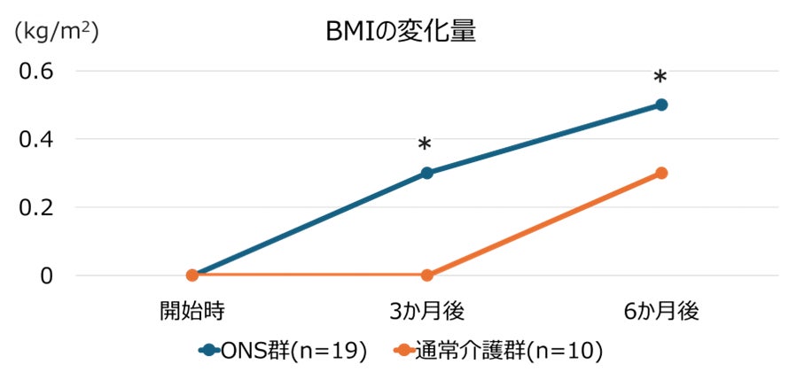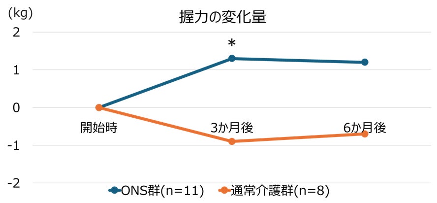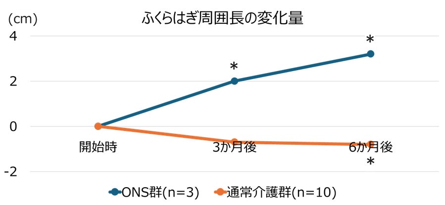 私たちのこれまでの研究結果から、低栄養もしくは低栄養リスクのある利用者がONSを継続摂取する事により、体重、BMI、握力、ふくらはぎ周囲長が摂取前と比較して有意に増加する事が確認されています※3。