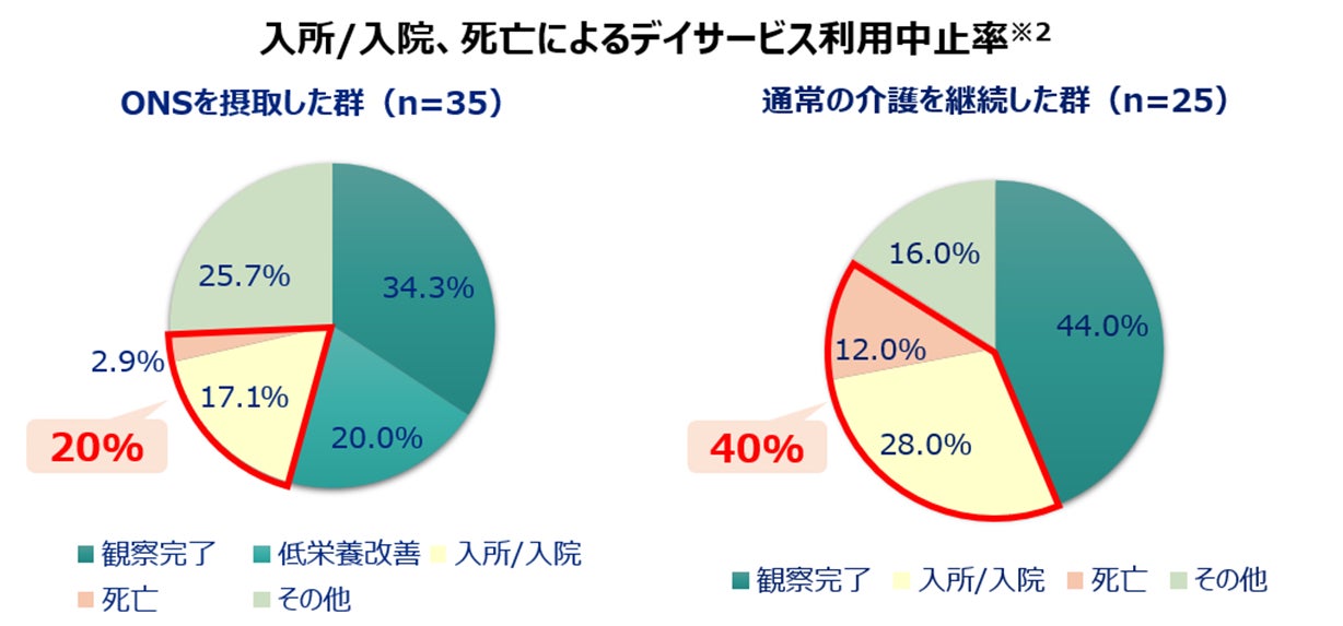 通所介護事業所の半数近くは赤字であり、利用率の低下が赤字の一因であると報告されており※2、経営状況の改善が課題です。私たちのこれまでの研究結果から、通所介護施設(デイサービス)を利用する高齢者の27.2%が低栄養もしくは低栄養のリスクがあることが確認され、低栄養もしくは低栄養リスクのある利用者が経口栄養補助食品(ONS)を継続摂取する事により、通常の介護(通常の食事提供のみ)を継続した場合と比較し、入院、入所等による、デイサービスの利用中止率が減少する事が明らかになりました※3。