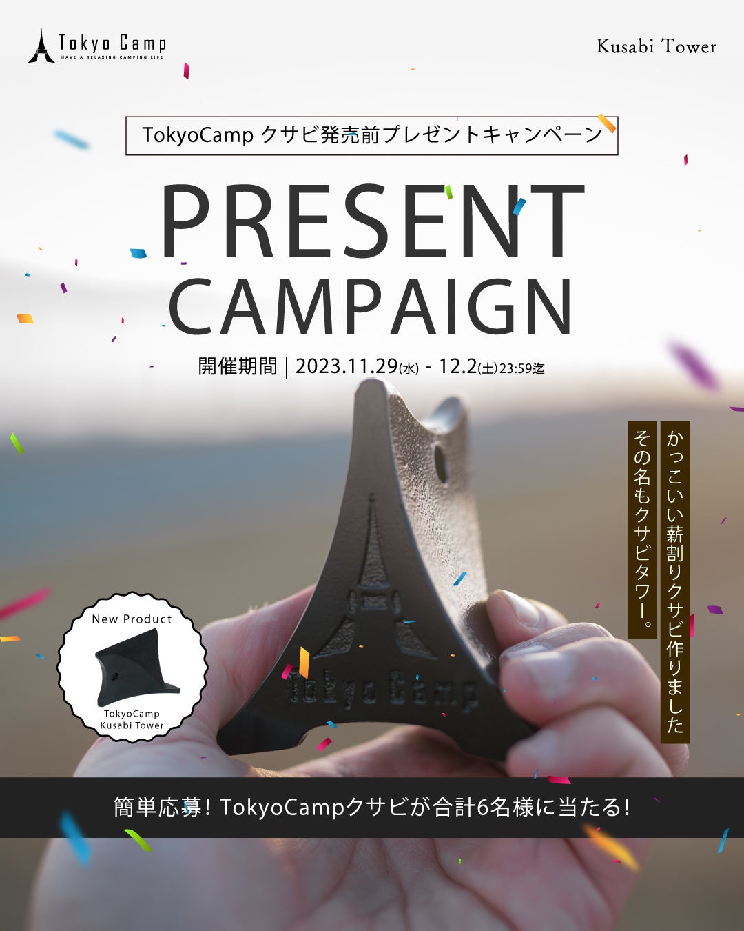 『TokyoCamp』の公式Xもしくは公式Instagramをフォローし、キャンペーン投稿を「リポスト」もしくは「いいね」していただいた方の中から抽選で合計6名さまにTokyoCamp薪割りクサビ『クサビタワー』をプレゼントいたします。