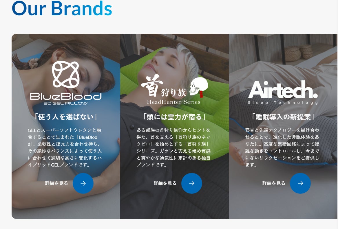 展開するブランドも「BlueBloood-ブルーブラッド」「HeadHunter-ヘッドハンター」「Airtech-エアテック」と増え、改めて当社の取り組みや、眠りを楽しむことへの考え方をより多くの方に届けるためにコーポレートサイトを刷新することにいたしました。