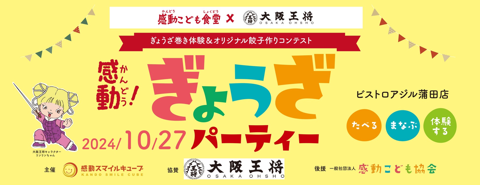 一般社団法人感動こども協会は、株式会社 大阪王将と協働し、『ぎょうざパーティー』を、2024年10月27日(日)に大田区西蒲田にある感動こども食堂「ビストロアジル 蒲田店」にて開催致しました。