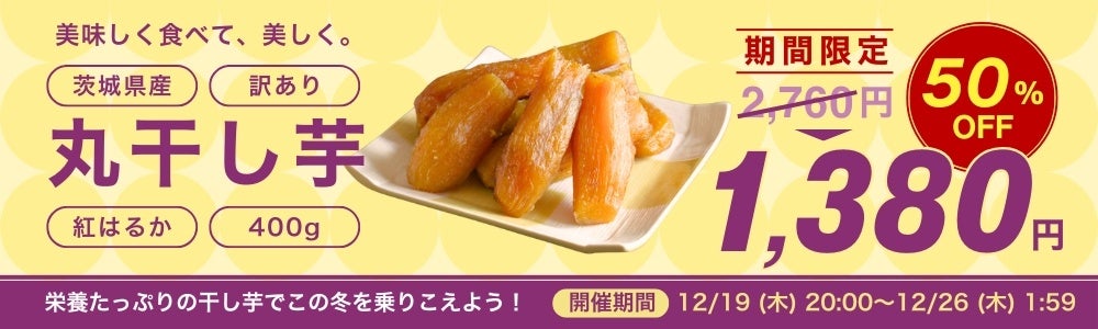姉妹店芋國屋(芋國屋 楽天市場店:https://www.rakuten.co.jp/imokuniya/)とコラボの大人気商品 『訳あり 紅はるか 丸干し芋 400g』が楽天大感謝祭の期間中、クーポンご利用で50%OFFでご購入いただけます。
