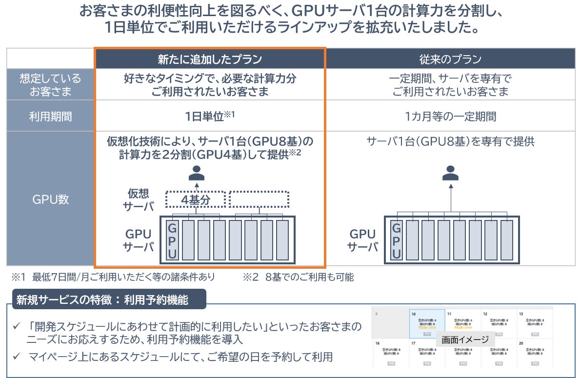 こうしたニーズにお応えするため、仮想化技術※4によりGPUサーバ1台の計算力を分割し、1日単位でご利用いただけるプランをラインアップに追加したものです。また、より計画的な利用を支援するため、GPUサーバの利用予約機能※5も導入しております。