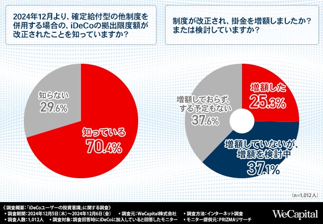 2024年12月に、確定給付型の他制度を併用する場合のiDeCoの拠出限度額が改正されたことについて約7割の方が知っていると回答し、実際に「増額した」「増額を検討中」という方が多いことがわかりました。