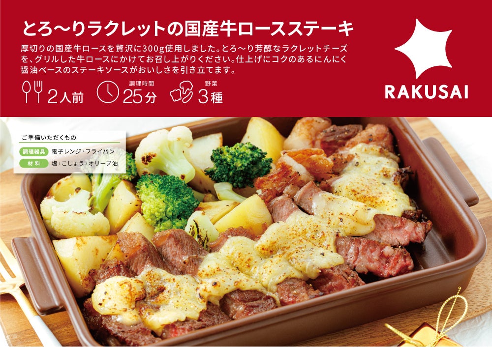 楽彩株式会社(本社:東京都足立区/代表取締役社長:大﨑善保)は、年末のパーティーシーズンにあわせて「とろ~りラクレットの国産牛ロースステーキ」と「セルバチコとアボカドのフレンチサラダ」の2品をセットにした“RAKUSAIスペシャルディナーセット”を11月25日(月)より200セット限定で予約販売をスタートします。慌ただしい年末をゆったりと贅沢にRAKUSAIのスペシャルディナーでお楽しみください。