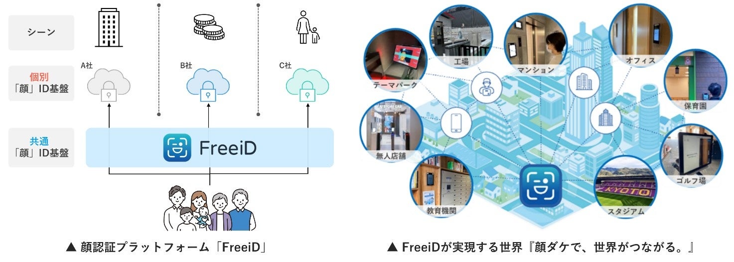 DXYZが開発提供する「FreeiD」は、世界中の様々な顔認証エンジンとつながる、『顔ダケで、世界がつながる。』を実現する顔認証プラットフォームです。特定の業界や利用シーンに縛られず、日々の暮らしの中でのあらゆる場面における「入退」「本人確認」「決済」等の行動を1つの顔でつなぐことのできる唯一無二のプラットフォームであることが最大の特徴です。