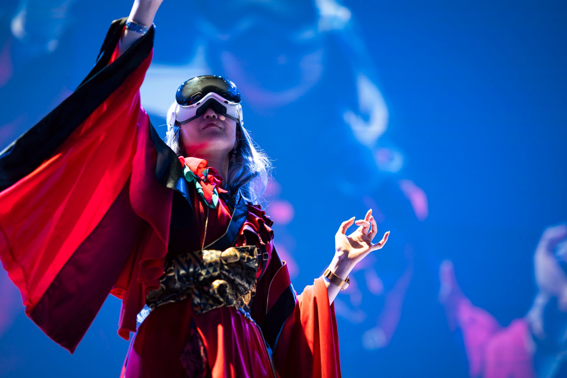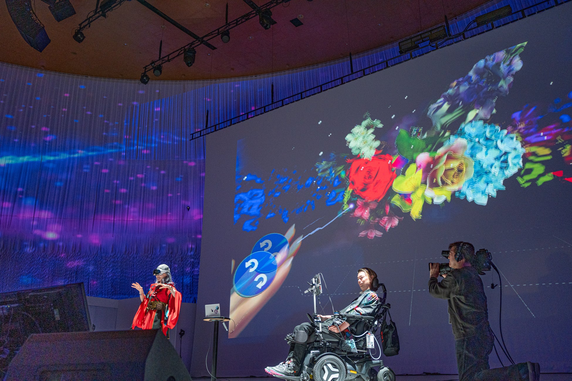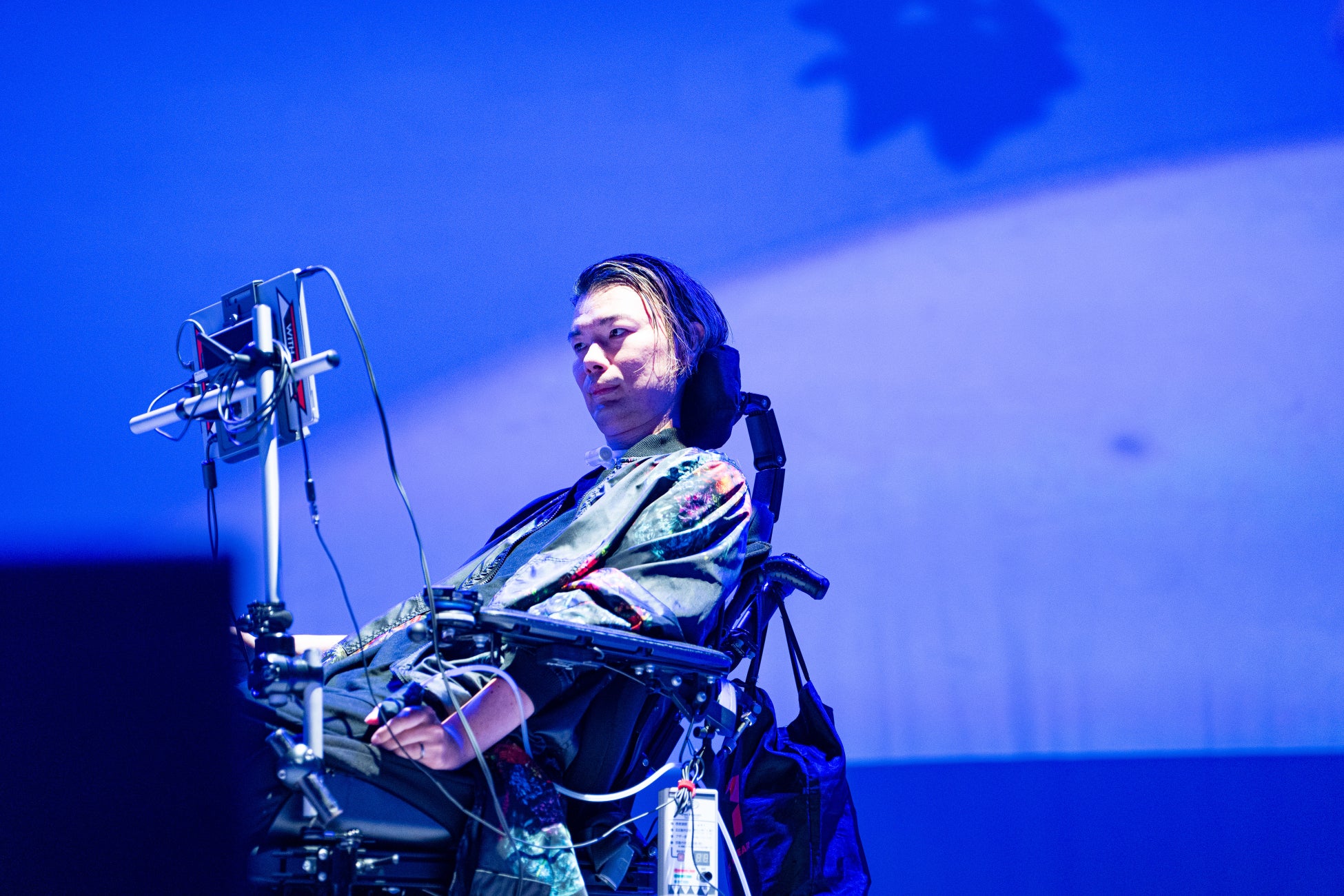本イベントのオープニングを飾ったのは「空間コンピューティングアート × WITH ALS COMMUNICATION CREATION」と題したライブパフォーマンス。筋萎縮性側索硬化症(ALS)のクリエイター武藤将胤氏が視線入力技術を駆使してDJパフォーマンスを行い、その音楽に合わせてXRアーティストのせきぐちあいみ氏がリアルタイムで空間上に3Dアートを制作する、これまでにない幻想的な風景が会場を包みました。