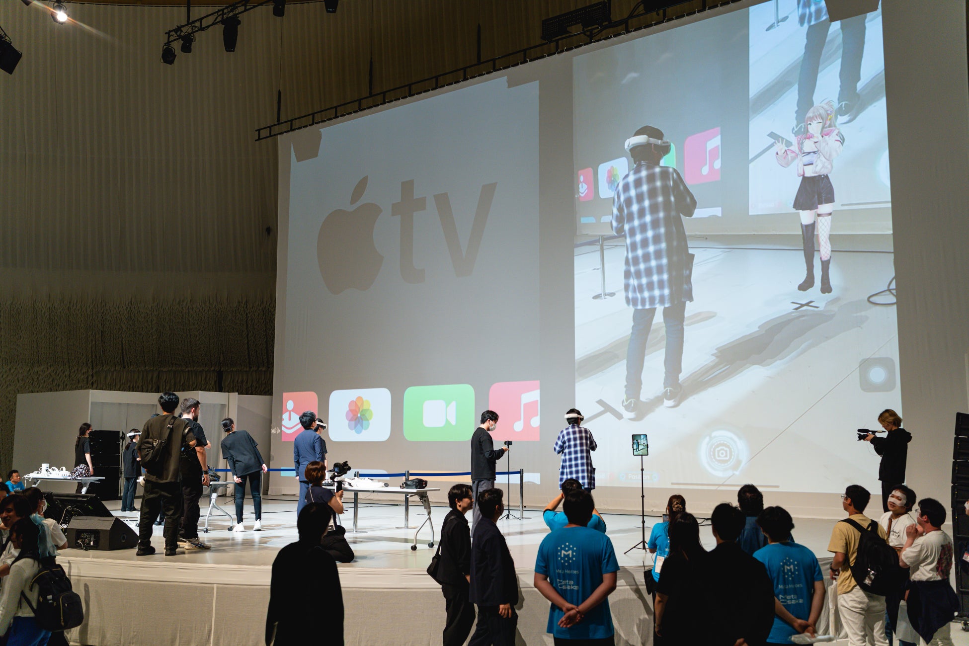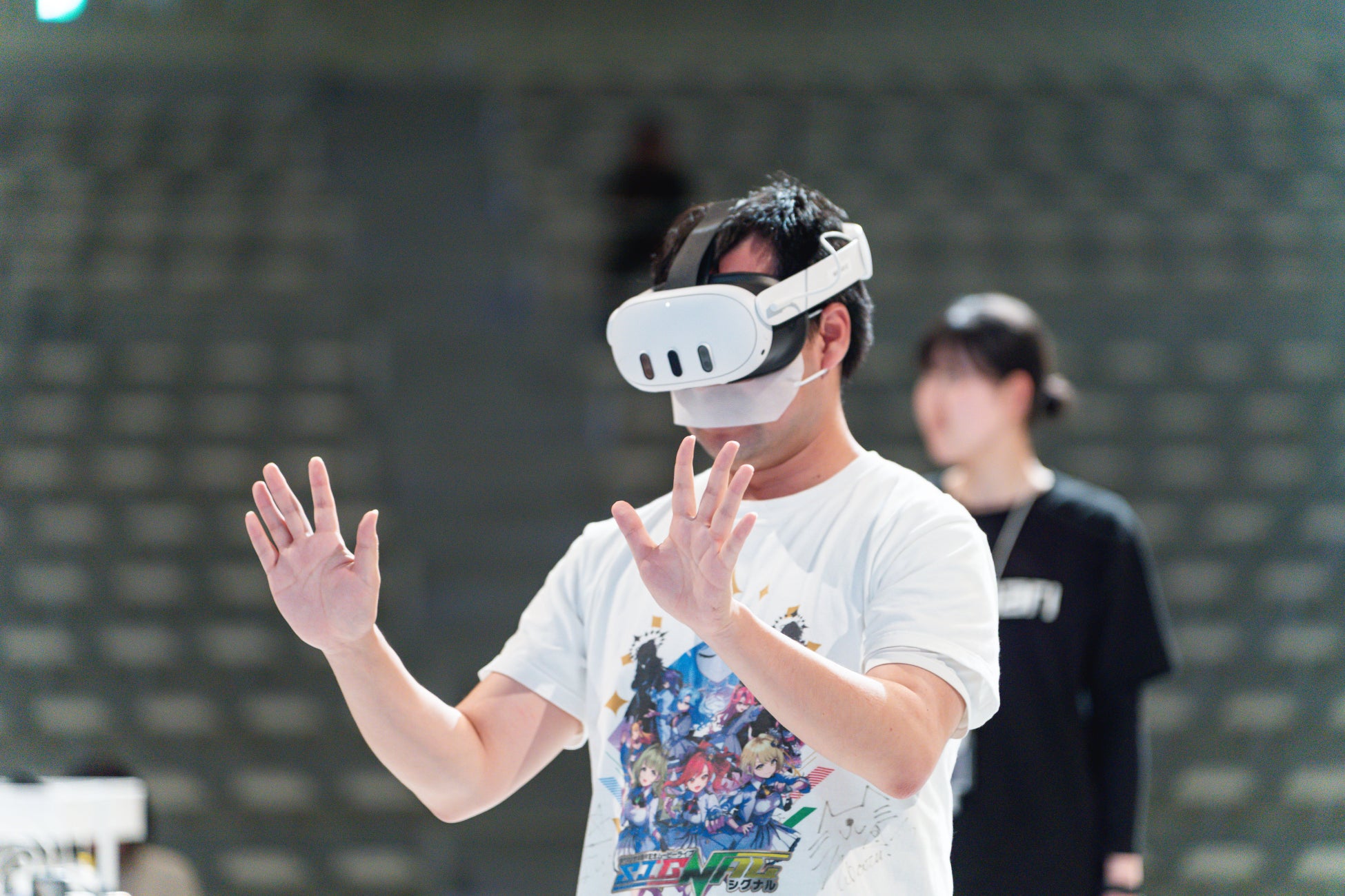 ライブ終了後には、事前申し込みされた方を対象に、XRデバイス(Meta Quest 3)を着用し、株式会社Mawariの最新技術により実現した等身大のバーチャルアーティストと対面でコミュニケーションができる特別な体験をしました。ライブを終えた鈴鳴すばるさん(まりなす)、燈舞りんさん(まりなす)、松永依織さんが目の前に登場すると、体験者たちは興奮した様子でハイタッチをしたり、話しかけたりしてコミュニケーションを楽しみました。
