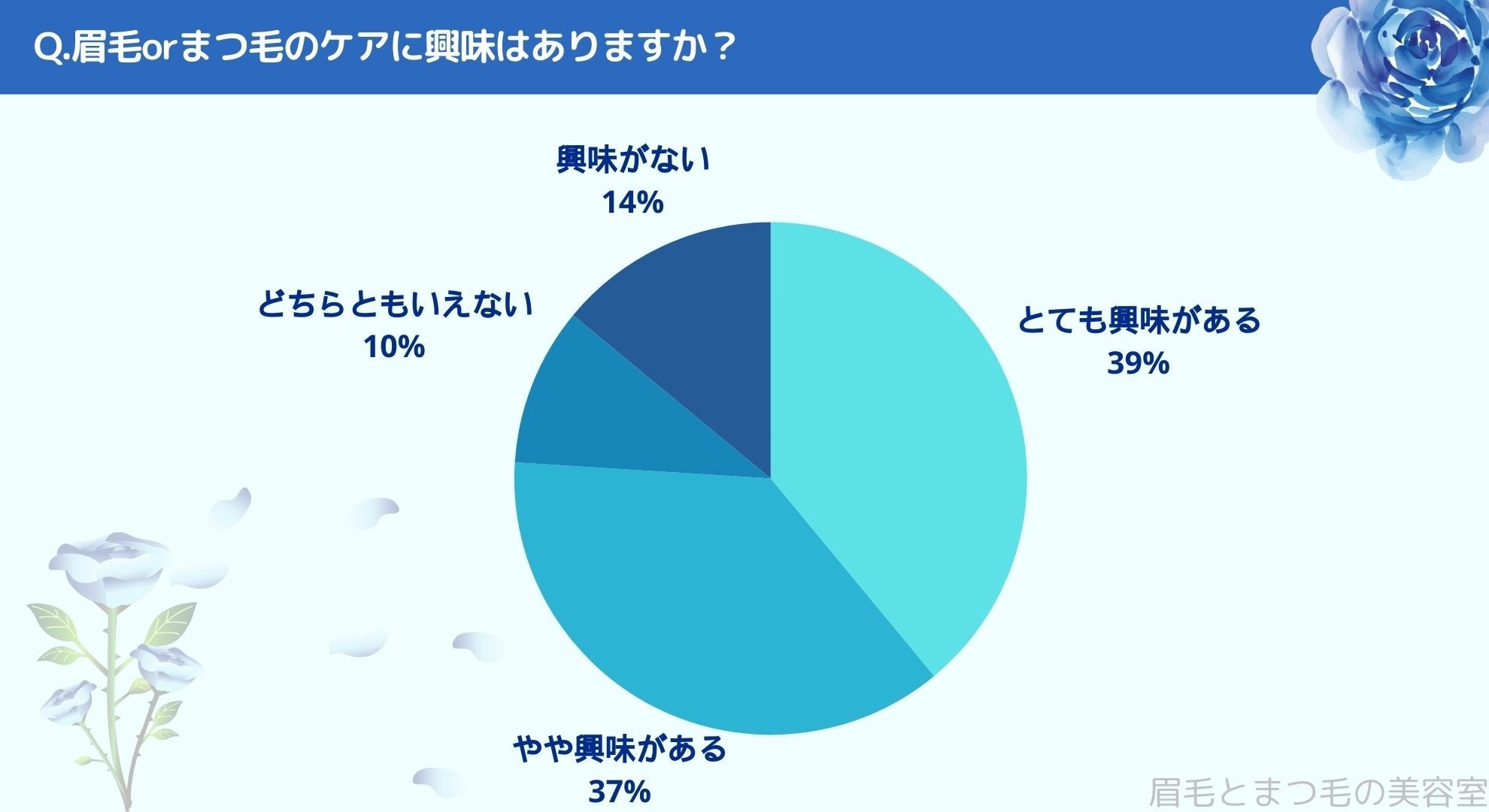 眉毛・まつ毛のケアに興味があるかお聞きしたところ「とても興味がある(39%)」、「やや興味がある(37%)」、「どちらともいえない(10%)」、「興味がない(14%)」という結果になりました。