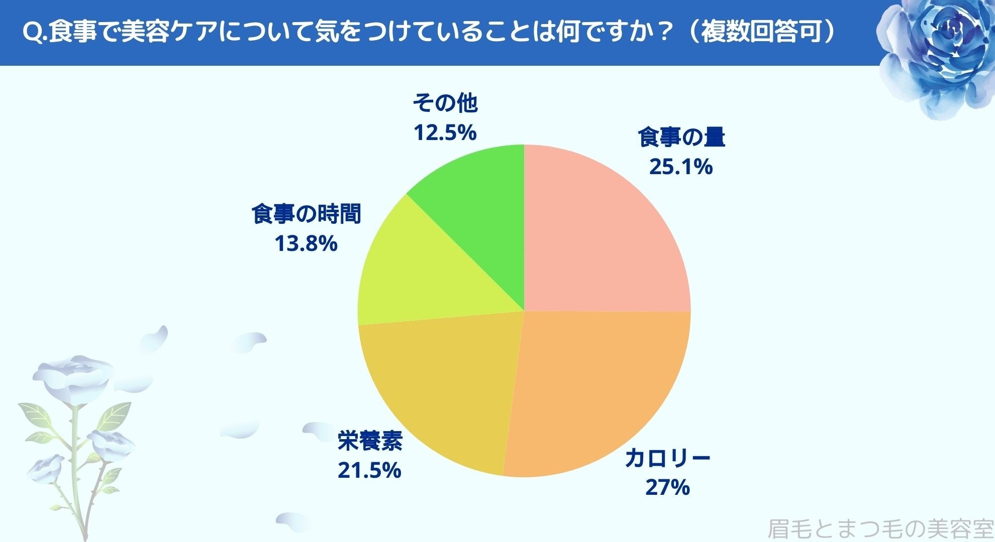 食事でどんな美容ケアをしているかお聞きしたところ「食事の量(25.1%)」、「カロリー(27%)」、「栄養素(21.5%)」、「食事の時間(13.8%)」、「その他(12.5%)」という結果になりました。