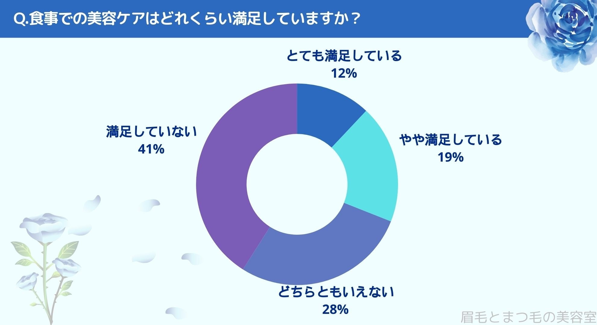 食事での美容ケアに満足しているかお聞きしたところ「とても満足している(12%)」、「やや満足している(19%)」、「どちらともいえない(28%)」、「満足していない(41%)」という結果になりました。