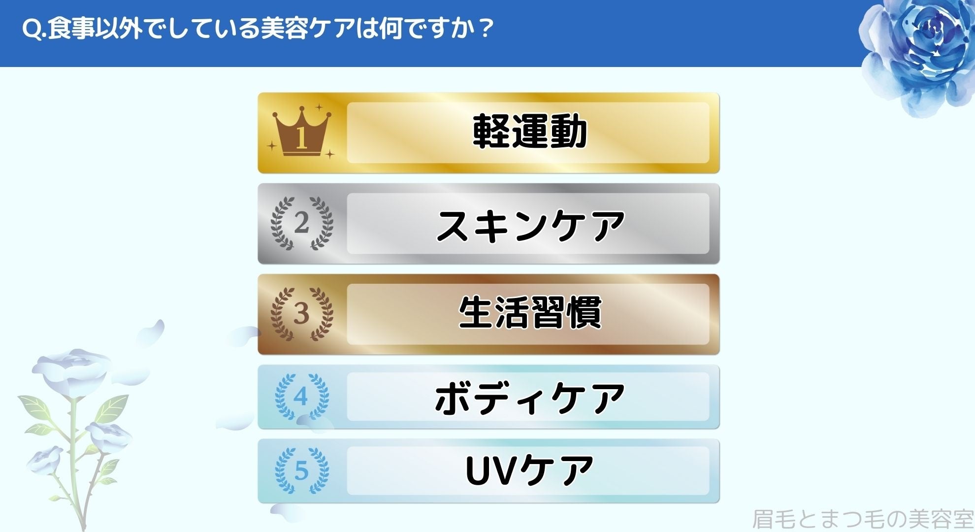食事以外でしている美容ケアについてお聞きしたところ「1位>軽運動」、「2位>スキンケア」、「3位>生活習慣」、「4位>ボディケア」、「5位>UVケア」という結果になりました。