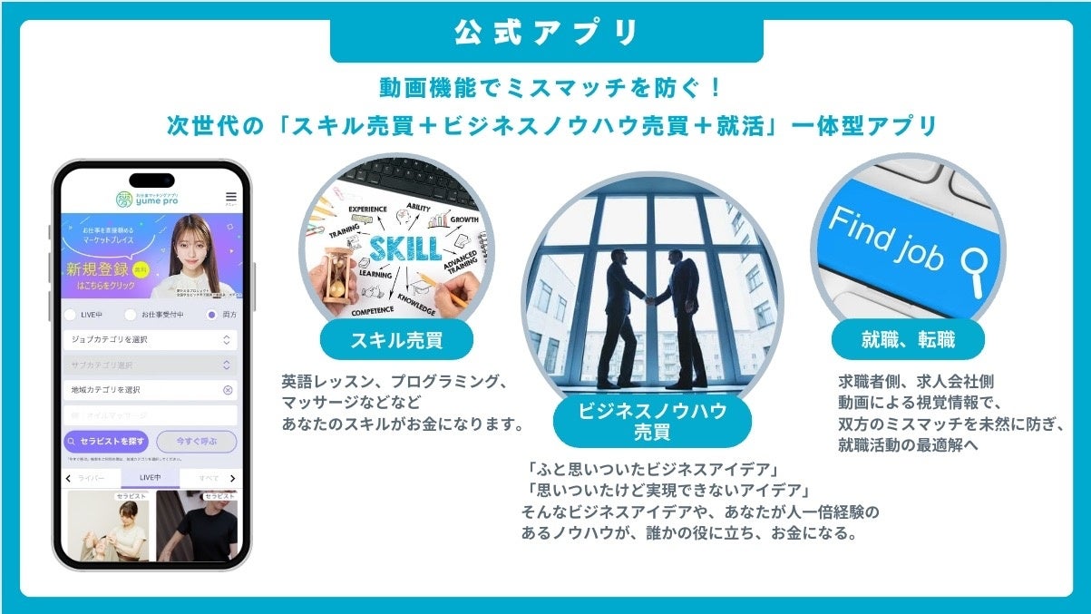 動画&ライブ配信機能でミスマッチを防ぐ! 次世代の「スキル売買+ビジネスノウハウ売買+就活」一体型のYUME PROアプリが待望のリリース!