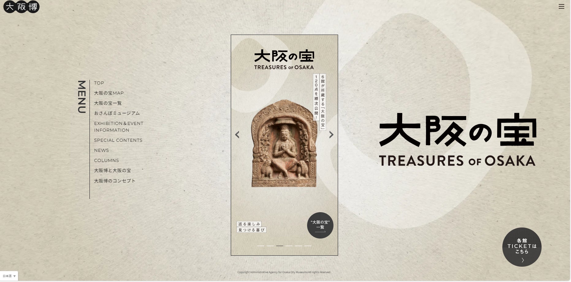 今回のリニューアルでは、デザインを一新。直観的に操作できるユーザビリティが高い画面へ変更しました。さらに、「大阪博」のメインコンテンツである「大阪の宝」120点(各館が選定)に関する情報や、各館のチケットページへのリンクを追加しました。