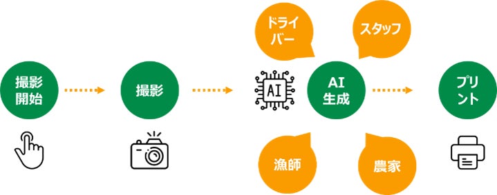 顔写真を撮影し、サービスを支えるさまざまな職種の人々に「へんしん」できる体験型フォトコンテンツ。AI画像生成技術により、グリーンビーンズを支える多彩な人物に変身したイラストがその場で完成します。