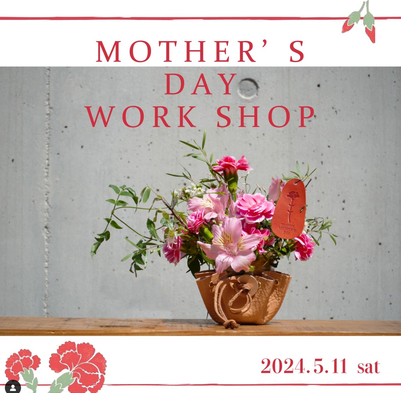 母の日に贈る生花のフラワーアレンジメント体験と、その生花を飾る花器にもなり、小物入れとしても使えるレザー巾着を手作りする体験を同時に行い、手作りした思い入れたっぷりの母の日ギフトを持ち帰ることができる。