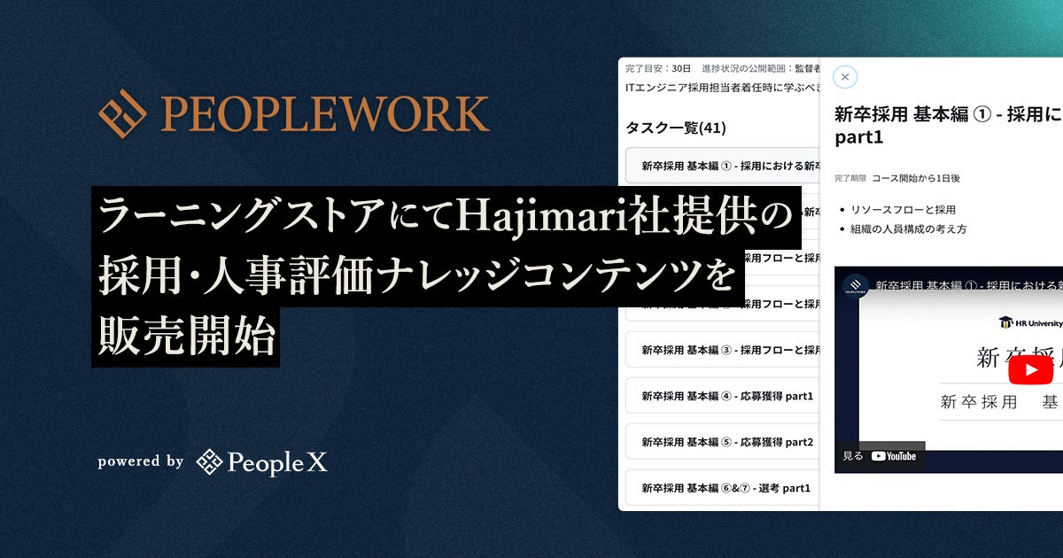 エンプロイーサクセス事業を推進する株式会社PeopleX(本社:東京都渋谷区、 代表取締役 CEO:橘 大地、以下:当社)は、「PeopleWork」のラーニングストアに、有料コンテンツとして株式会社Hajimari(東京都渋谷区、代表取締役 :木村 直人、以下「Hajimari」)の提供による採用・人事評価ナレッジコンテンツを販売開始したことをお知らせいたします。
